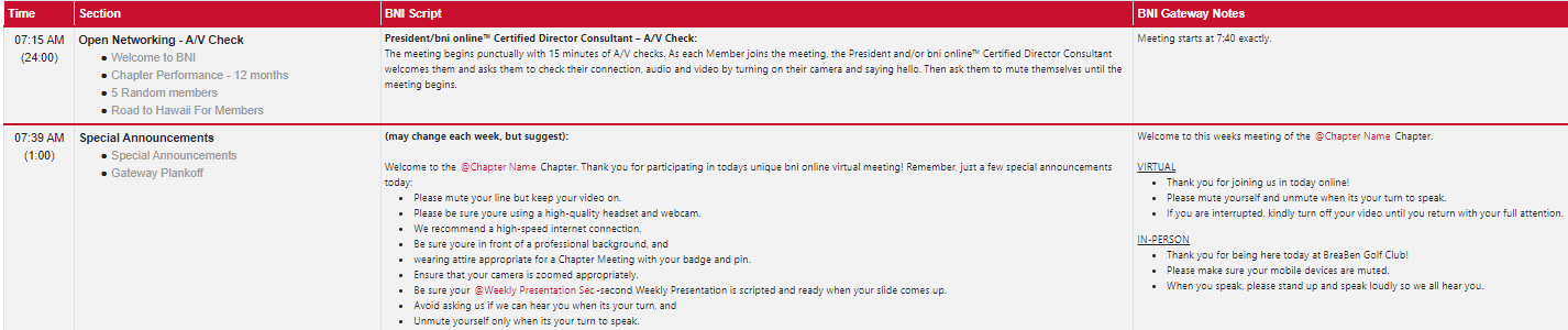 To access the script, select Meeting > Script. The BNI master script and chapter notes are displayed in two columns by section. |