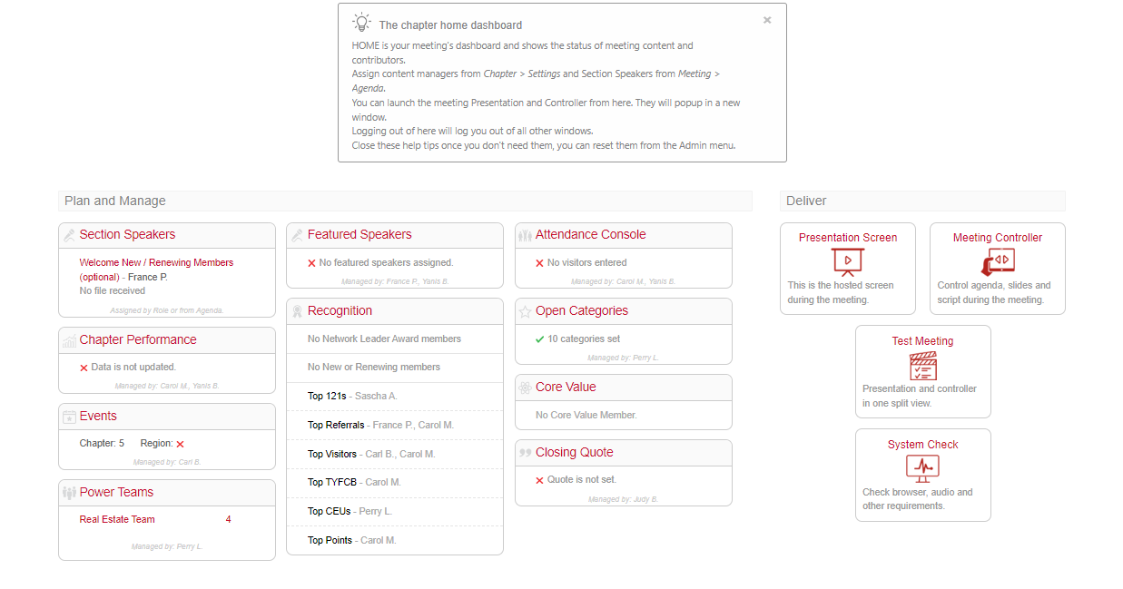 Leadership logs into a dashboard that summarizes all information and content required for a meeting.