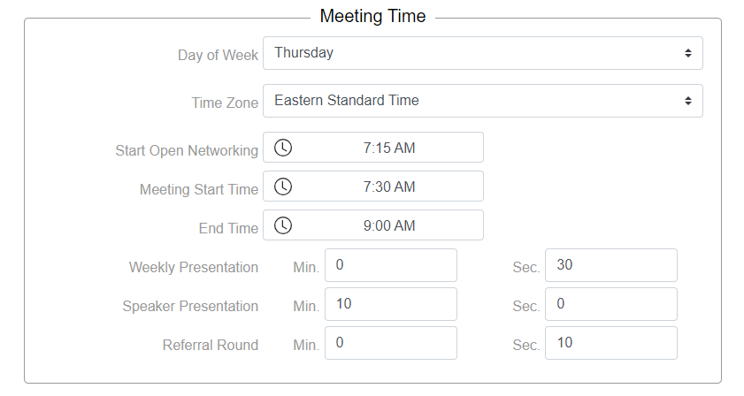 First, set your day of the week and time zone. Then set 3 times to define the schedule: 1) Start Open Networking: this sets the time for open-networking and AV checks. 2) Meeting Start Time: the official start time of the meeting when the president begins the meeting. 3) End Time: sets the scheduled end time of the meeting. |