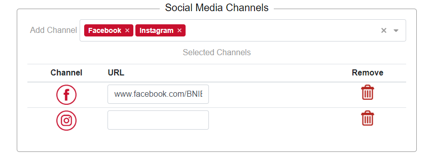 One or more social media links can be defined for the chapter. This can include Facebook, Instagram, or LinkedIn.
