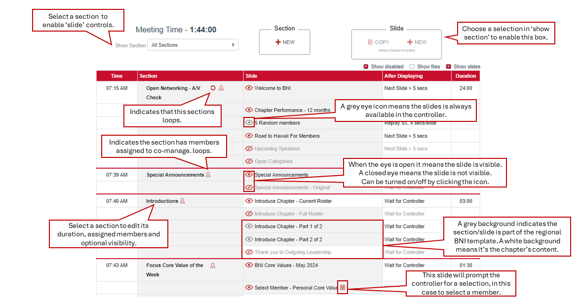 Chapters can add their own slides or insert a section as required. The chapter’s slides can be dragged and re-ordered within the agenda, but the region’s sections and slides cannot be moved. Once a meeting section is created, it will appear in the bottom row of the agenda.