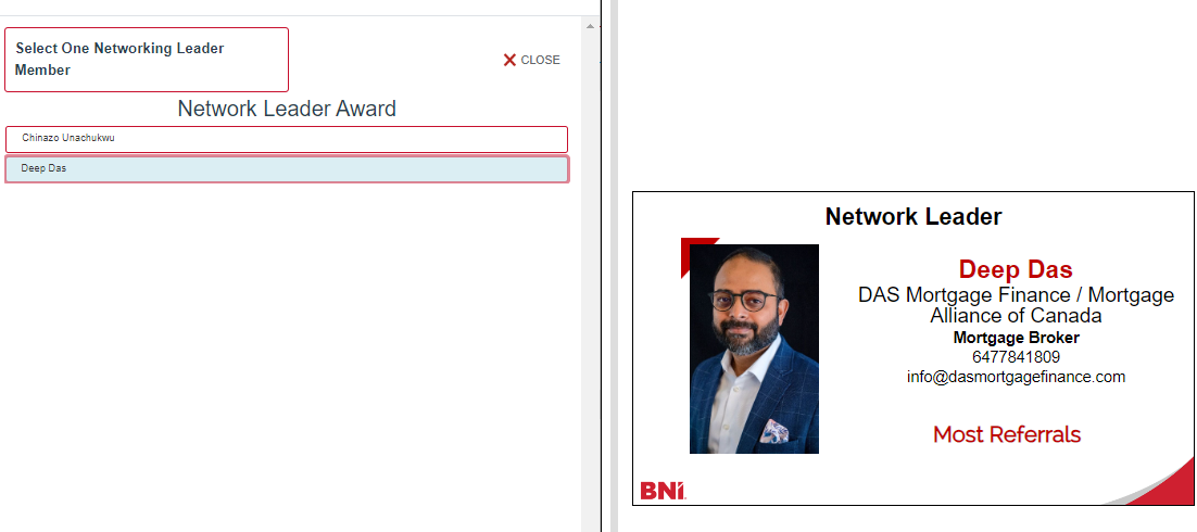 For Network Leader Award or New or Renewing Member, select the section then the slide to show all or select a specific member being recognized.