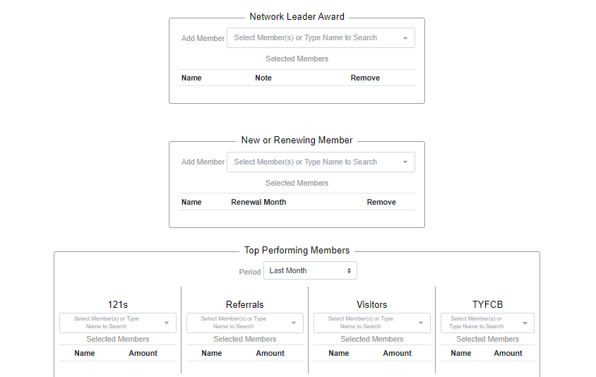 Some regions allow for Top Performer recognition. In this case one or more members are assigned to 121, Referrals, Visitors or TYFCB awards.