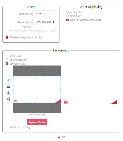 Settings is common to all slides and defines the transition, language, background, and behavior after displaying the slide.