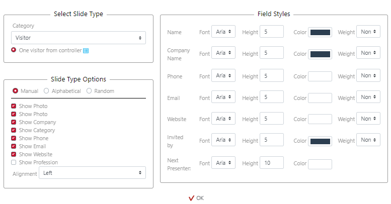 Each category (except the Blank) will show available templates to select from.  Each template will enable slide elements that can be scaled and positioned on the slide.  These special elements are formatted from the Slide Type view.