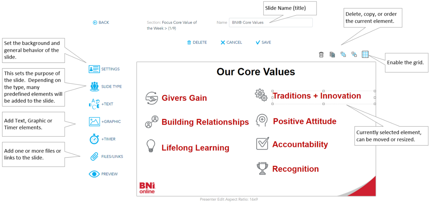 BNI+ slides are delivered in 1080p full HD with a resolution of 1920x1080.  This is also known as an aspect ratio of 16:9.