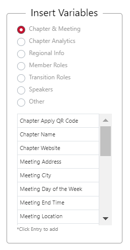 For example, the variable {Members_President} returns the name of president of the chapter.