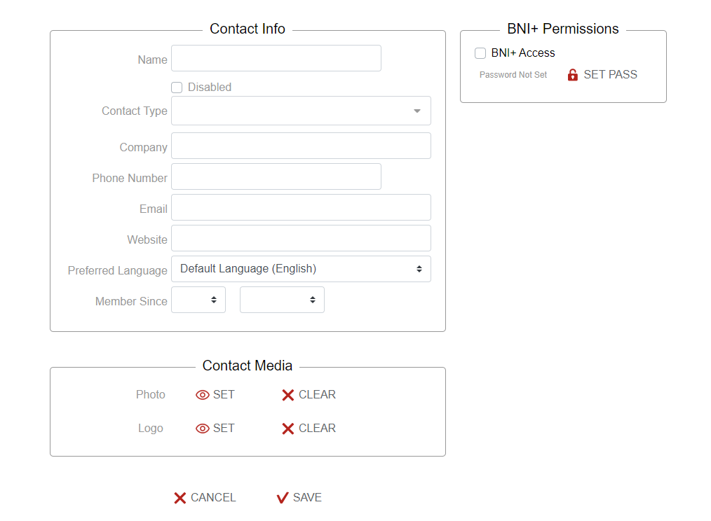 Contacts are accessed through Region>Contacts. Add your regional contacts and BNI+ access permission by selecting NEW. Fill in the contact details and select SAVE. These contacts are available to all of your chapters including core chapters.