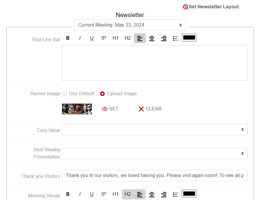 Chapters can customize the layout of the newsletter by selecting Set Newsletter Layout.